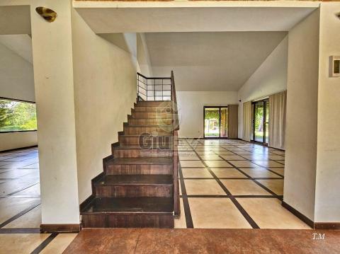 Dentro de la vivienda de espectacular diseño, nos encontramos un recibidor que distribuye tanto a su enorme salón, como a una preciosa cocina con zona comedor, cuyas vistas al exterior, harán de cualquier comida una experiencia deliciosa. También, tanto desde la cocina como el salón, se puede acceder a un bonito porche que comunica con la zona de piscina, con las múltiples posibilidades que ofrece. El salón, cuenta con varias vidrieras al exterior, otorgando mucha luz natural además de acceso al jardín y vistas al precioso entorno. También, cuenta con una gran chimenea, que dota al espacio de un ambiente cálido para esos días más fríos de invierno. A través de sus escales de diseño, que recuerdan a la proa de un barco, se sube a la planta superior donde existe una habitación con vestidor, zona de jacuzzi, y gran terraza con vistas a la piscina. CONSULTAR PRECIO